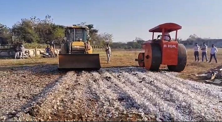 गडचिरोली : जिल्ह्यात दारुबंदी असताना अवैधरित्या दारुची वाहतूक करण्याचा प्रयत्न करणाऱ्यांवर पोलीस अधीक्षक नीलोत्पल यांच्या आदेशान्वये सातत्याने कारवाया केल्या जात असतात. त्यानुसार जप्त मुद्देमाल जागेअभावी दीर्घकाळापासून जतन करून ठेवणे अडचणीचे ठरत असल्याने देसाईगंज पोलिसांनी तो रोड रोलरखाली चिरडून नष्ट केला. त्यात सन 2023 ते 2025 या कालावधीतील दाखल 372 गुन्हयांमधील 19 लाख 67 हजार रुपयांच्या देशी-विदेशी दारूचा समावेश होता.
