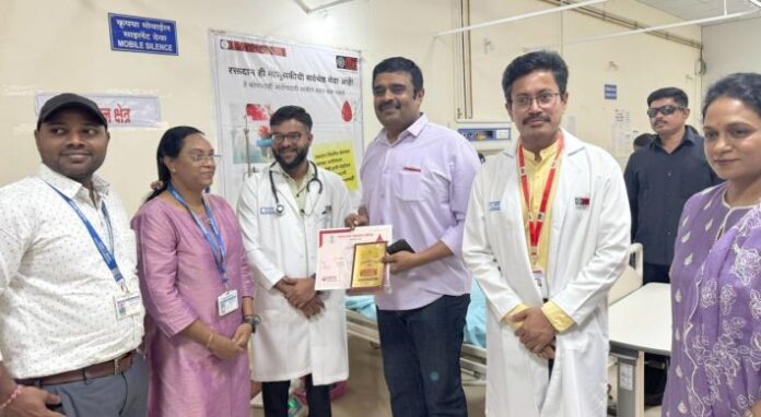 स्वेच्छा रक्तदानाचे प्रमाणपत्र स्वीकारताना लॅायड्चे एमडी बी.प्रभाकरन, सोबत वैद्यकीय पथक
