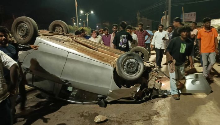 रस्त्यालगतच्या कठड्यांना धडकून फिल्मी स्टाईल उडाली भरधाव कार