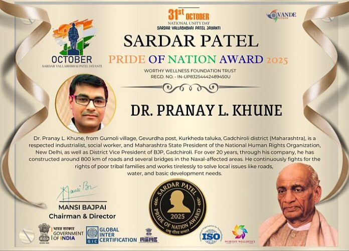 गडचिरोली : राष्ट्रीय मानवाधिकार संघटनेचे प्रदेशाध्यक्ष डॉ.प्रणय खुणे यांची सरदार पटेल प्राईड ऑफ नेशन या पुरस्कारासाठी निवड करण्यात आली आहे. राष्ट्रीय मानवाधिकार असोसिएशनच्या माध्यमातून विविध सामाजिक उपक्रम राबवण्यासोबत अनेक महत्त्वाच्या मागण्या शासन दरबारी मांडून न्याय मिळवून देण्यासाठी केलेल्या प्रयत्नांची दखल घेऊन वर्दी वेलनेस फाउंडेशन ट्रस्ट, दिल्ली यांनी सदर निवड केली आहे.