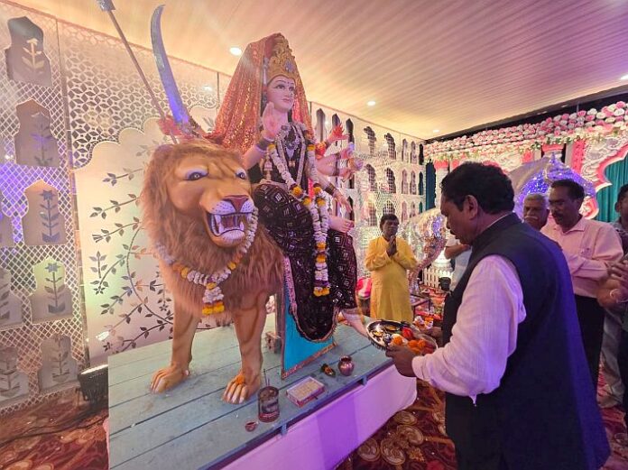 गडचिरोली शहरातील रेड्डी गोडाऊन चौकात अनेक वर्षांपासून भाविकांच्या श्रद्धेचा केंद्रबिंदू ठरलेल्या दुर्गामाता उत्सवात यंदाही परंपरा जपत दुर्गा उत्सवाला सुरूवात झाली. नवशक्ती दुर्गा उत्सव मंडळाच्या वतीने आयोजित रेड्डी गोडाऊन चौकातील दुर्गादेवीच्या पहिल्या आरतीचा मान माजी खासदार तथा भाजपा अनुसूचित जनजाती मोर्चाचे राष्ट्रीय महामंत्री डॉ.अशोक नेते यांना लाभला. यावेळी डॉ.नेते यांनी मनोभावे माता दुर्गेचे पूजन करून “समाजातील प्रत्येकाच्या जीवनात सुख-समृद्धी, आनंद व आरोग्य लाभो” अशी मंगलकामना केली.
