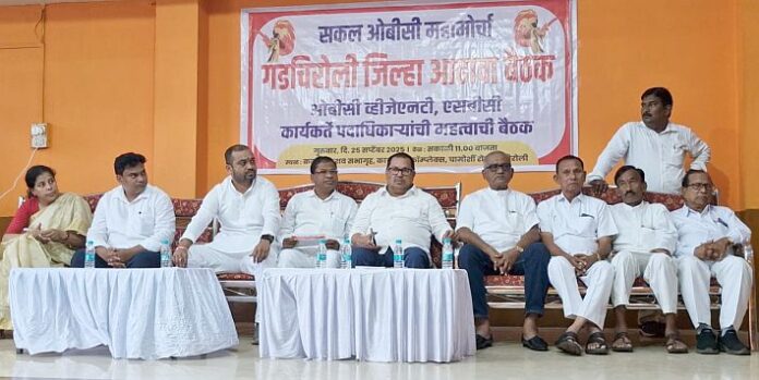 गडचिरोली : मराठा समाजाला कुणबी ठरवून ओबीसी प्रवर्गातून वाटा देण्याबाबत काढलेला जीआर ओबीसींच्या मुलभूत हक्कांवर, अधिकारांवर गदा आणणाला असल्याने तो जीआर रद्द करण्याच्या मागणीसाठी येत्या 10 आॅक्टोबरला नागपुरात ओबीसी समाजाचा महामोर्चा काढला जाणार आहे. त्याच्या तयारीसाठी गुरूवारी (दि.25) येथील कात्रटवार कॅाम्प्लेक्समधील सभागृहात ओबीसी समाजबांधवांची सभा घेण्यात आली. यावेळी काँग्रेसचे विधिमंडळ पक्षनेते, माजी मंत्री विजय वडेट्टीवार यांच्यासह अनेक मान्यवरांनी आपल्या भावना मांडत एकजुटीने या महामोर्चात सहभागी होण्याचा निर्धार व्यक्त केला.