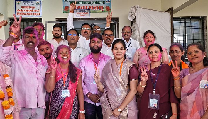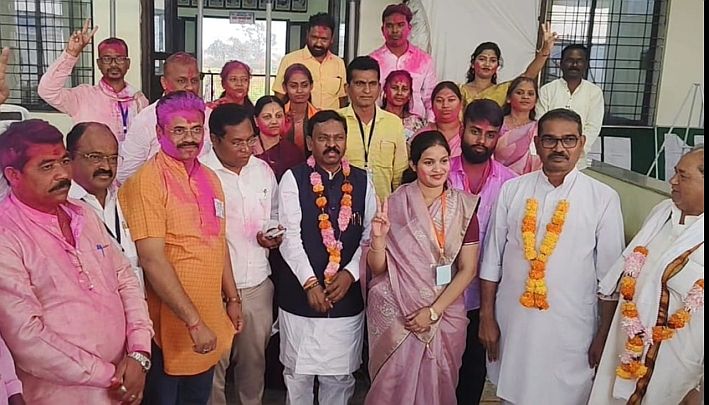 गुलाल उधळून विजयी उमेदवारांचे अभिनंदन करताना भाजपचे नेतेमंडळी
