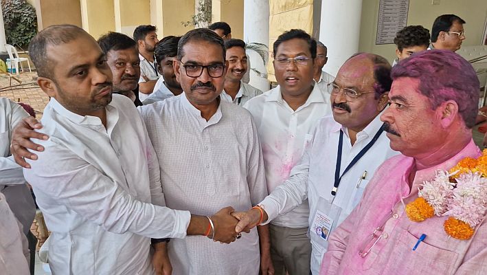 भाजपच्या पदाधिकाऱ्यांचे अभिनंदन करताना काँग्रेसचे पदाधिकारी.