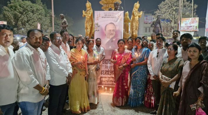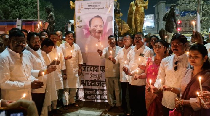 गडचिरोली : दिवंगत उपमुख्यमंत्री तथा राष्ट्रवादी काँग्रेसचे राष्ट्रीय अध्यक्ष अजित पवार यांना गुरुवारी संध्याकाळी गडचिरोलीच्या इंदिरा गांधी चौकातील राजीव गांधी खुल्या सभागृहात सर्वपक्षीय शोकसभेतून श्रद्धांजली वाहण्यात आली. यावेळी माजी खासदार आणि भाजपचे राष्ट्रीय महामंत्री (एसटी मोर्चा) अशोक नेते, आ.डॅा.मिलिंद नरोटे यांच्यासह सर्वच पक्षांच्या पदाधिकाऱ्यांनी यावेळी आपल्या भावना व्यक्त करत अजितदादांचे गडचिरोली जिल्ह्याच्या विकासातील योगदान सांगून त्यांच्या आठवणींना उजाळा दिला. यानंतर इंदिरा गांधी चौकात मेणबत्त्या प्रज्वलित करून दादांचा जयघोष करण्यात आला.