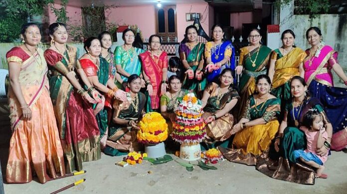 गडचिरोली : येथील आरमोरी मार्गावरच्या लक्ष्मीनगर वॅार्डातील महिलांनी 29 सप्टेंबर रोजी बतकम्मा देवीचा उत्सव साजरा केला. यात महिलांनी उत्स्फूर्तपणे सहभागी होऊन दाक्षिणात्य पद्धतीने पुजाअर्चा करत दांडिया नृत्य सादर केले.